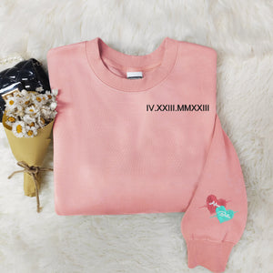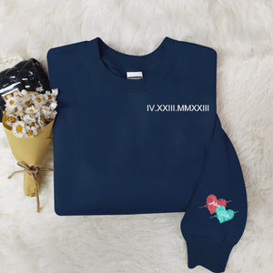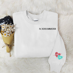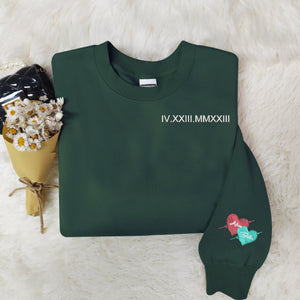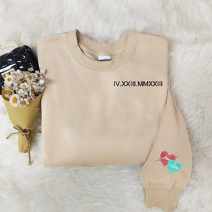 Customized Roman numeral embroidered sweatshirts for couples, with the coupleās names embroidered on the cuffs.