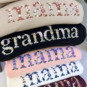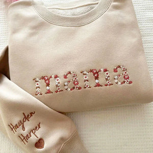 ThisĀ custom floral "Mama" sweatshirtĀ is the perfect way to honor the special woman in your life. Featuring aĀ hand-stitched floral nicknameĀ (like "Mama," "Mommy," or "Nana") and personalized sleeves with her childrenās names, itās a heartfelt gift sheāll treasure forever.