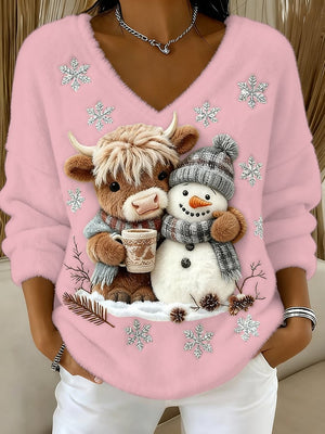 Women's Animal Highland Cow Yeti Art Print V-Neck Top