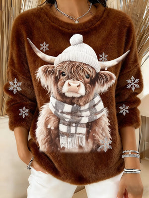 Women's Animal Highland Cow Art Print Round Neck Top