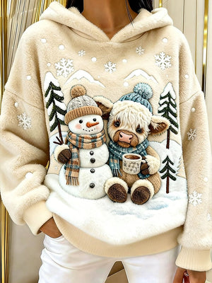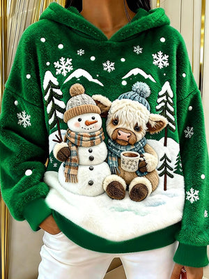 Women's Highland Cow Snowman Flannel Hooded Sweatshirt