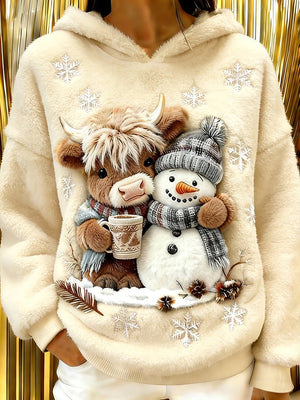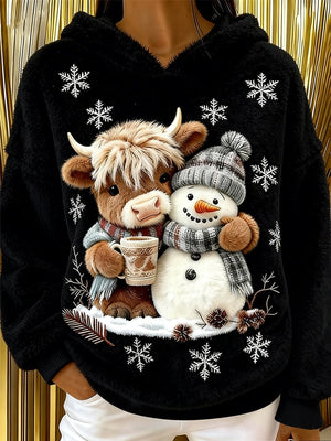 Women's Highland Cow Snowman Flannel Hooded Sweatshirt